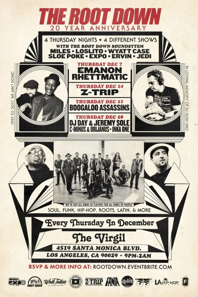 THE ROOT DOWN celebrates 20 years beginning Thursday Dec 7 at it’s old stompin’ grounds – Little Temple now called The Virgil. This will be a monthly celebration every Thursday in December featuring artist that had launched at The Root Down and blown a little up since then. Emanon (Aloe BLacc & Exile), Rhettmatic, DJ Z-Trip, Boogaloo Assassins, DJ Day, Jeremy Sole to name just a few. You don’t want to miss any of these Thursdays since you may never get a chance to experience The Root Down at it’s finest again.